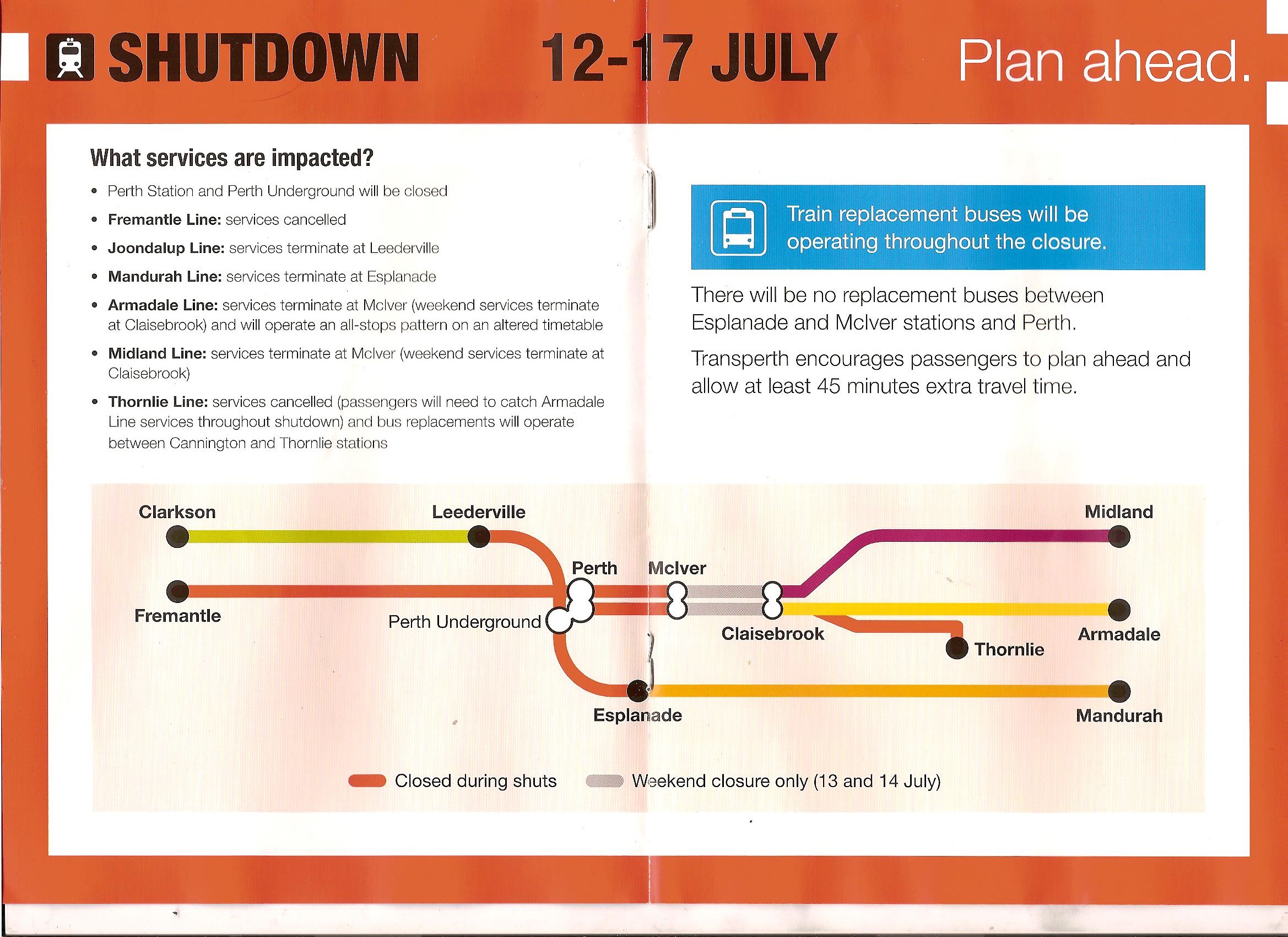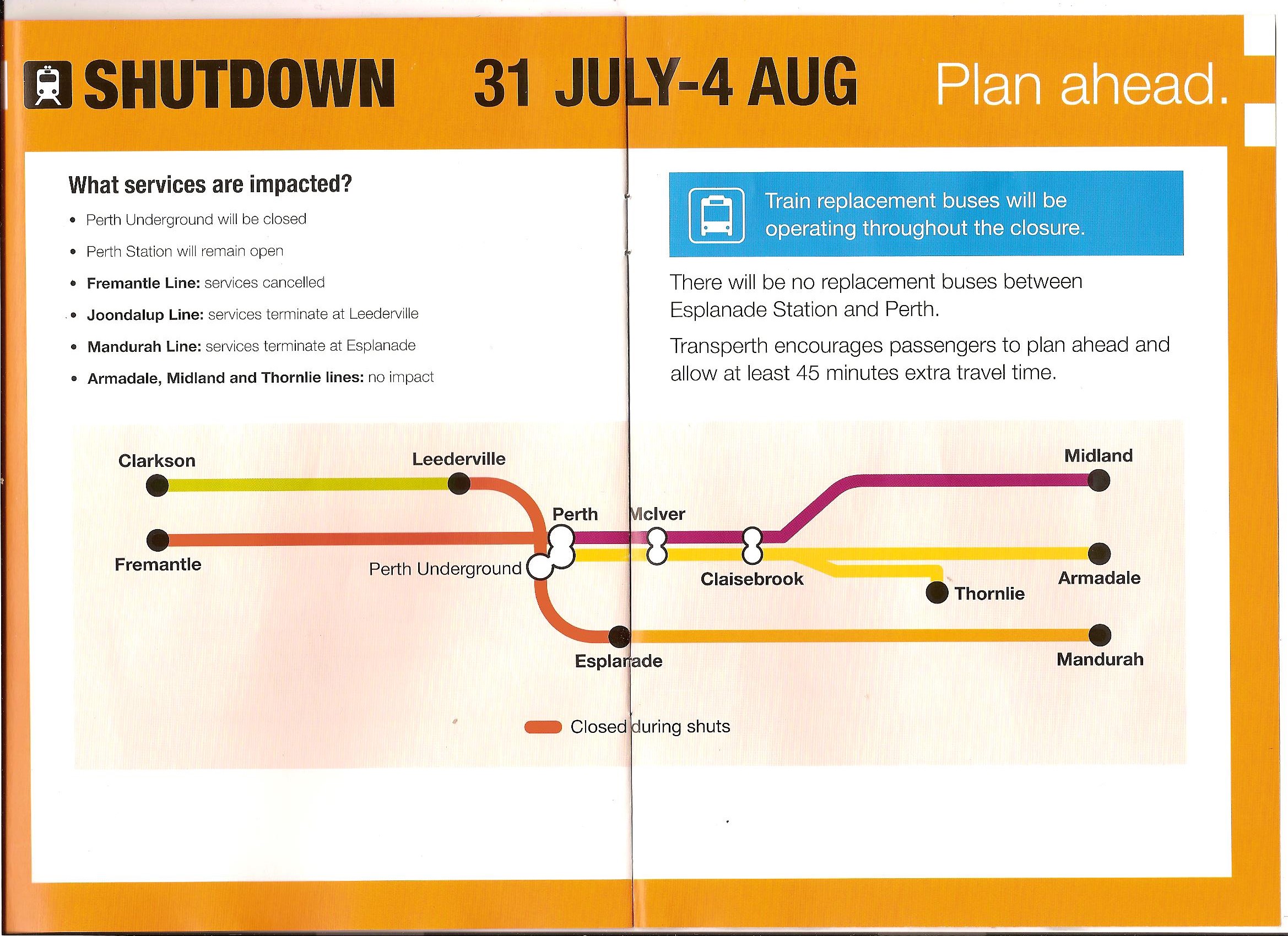 “To connect the new tunnel to the Transperth rail network, two shutdowns are need. The first will take place during the second week of the July school holidays, from 7pm Friday 12 July to last service on Wednesday 17 July. From Thursday 18 July trains will start using the new Fremantle Line tunnel and there will be platform changes in Perth Station. The Fremantle to Midland through-service will also return.” From 3pm Wednesday 31 July to last service on Sunday 4 August a second shutdown will take place so trains can switch between the Fremantle and Joondalup line tunnels, which is said to improve how the network operates. (Transperth 2013)