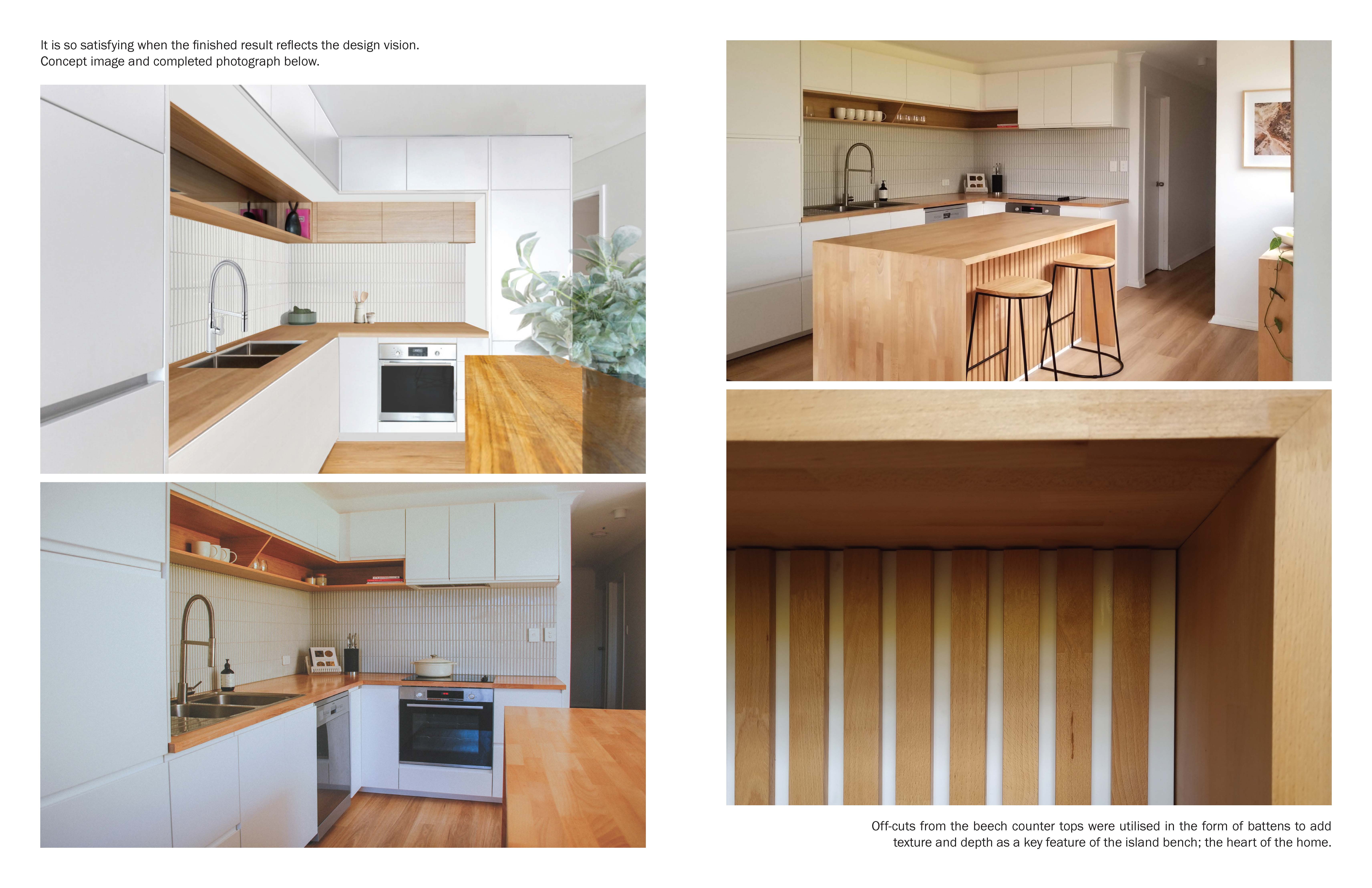 A dramatic move to re-plan the original U-shaped kitchen involved removing an obstructive brick pillar and half height wall, and installing a structural beam within a tight ceiling cavity. This opened up the kitchen to the dining and living areas, allowing for a new island bench (providing increased kitchen prep and storage space) to become the heart of the home.