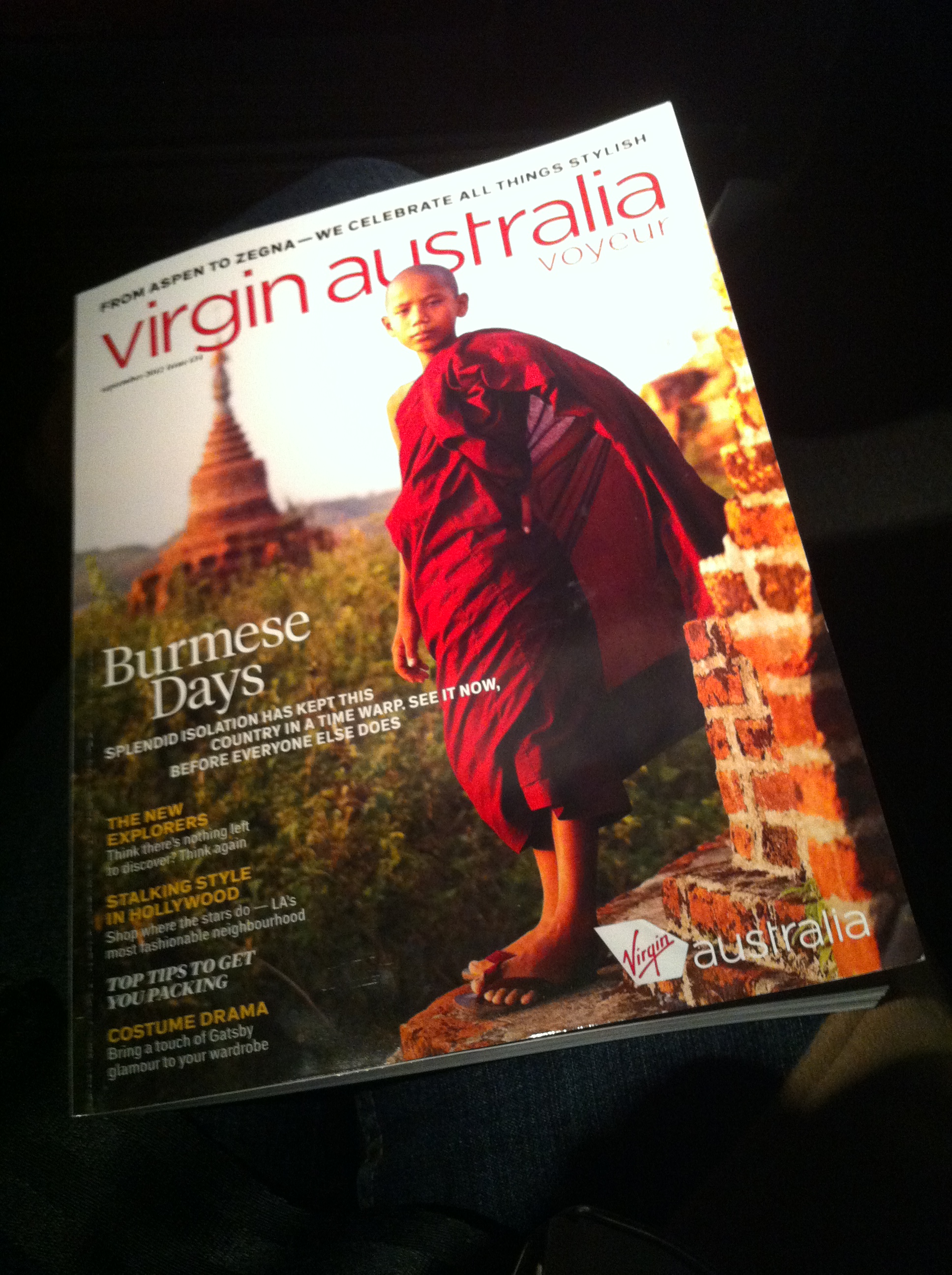 Look who’s on the cover of Virgin Australia’s inflight magazine this month. Burma is possibly the hottest travel destination in South East Asia this year. Blame this on the political revolution that saw a shift from military to civilian government, the inauguration into parliament of Nobel Peace Prize laureate and democracy icon Aung San Suu Kyi, and the related – if not consequential – lifting of sanctions, wiping of debts and abolishing of key economic restrictions. I am happy with these positive, although slightly overdue, developments for the economic growth of the country, however, I wonder if the country will be able to withstand the side effects of tourism.